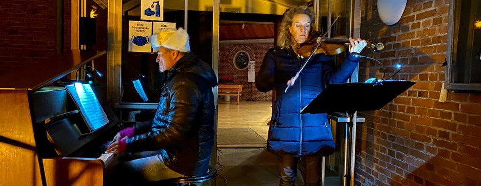 Am 1. Advent (28. November 2021) gab es wieder einen Adventsumtrunk vor der Himmelfahrtskirche, und zwar direkt im Anschluss an den Familiengottesdienst mit Pfarrerin Claudia Weyh. Beim Umtrunk gab's Glühwein und Punsch, Lebkuchen und Gebäck. Diesmal musikalisch umrahmt vom Duo Keys & Strings.