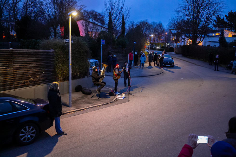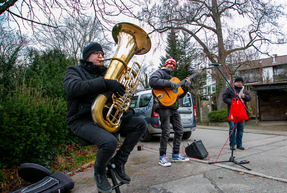 Am Nachmittag des 27. Dezember 2020 hat das Acoustic Swing Trio einen ganzen Nachmittag lang an verschiedenen Plätzen im Schönberg musiziert – von Weihnachtsmusik über Swing bis Rock’n’Roll. Für alle Schönberger. Kostenlos. Coronasicher: vom Fenster aus oder mit Sicherheitsabstand.